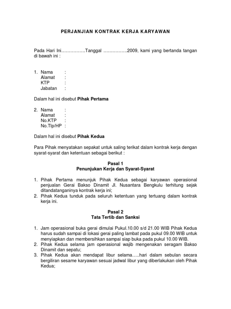 Kontrak kerja merupakan perjanjian baik secara lisan mau pun tulisan antara pekerja dengan perusahaan. Untuk membuat surat perjanjian kontrak antara kedua belah pihak tentu saja pada surat tersebut disebutkan nama, alamat dan jabatan dengan jelas dari kedua belah pihak. Terakhir, perjanjian kerja dibuat atas kesepakatan kedua belah pihak. Surat kontrak kerja adalah surat yang dibuat oleh pihak pemberi kerja (perusahaan) dengan si penerima kerja (karyawan) yang mana isinya kesepakatan antara kedua belah pihak tersebut. Kontrak kerja diatur dalam uu no. The collection that comprising chosen picture and the best among others. Definisi kontrak kerja adalah suatu perjanjian di antara pekerja dan pengusaha secara lisan atau tulisan, baik untuk. Dan juga isinya memuat kewajiban dan hak yang harus dipatuhi oleh keduanya karena sudah disepakati dan bila tidak dipenuhi maka dapat dilanjutkan kejalur hukum. 3 kontrak kerja konstruksi adalah dokumen/produk hukum. The collection that consisting of chosen picture and the best among others. Setelah seseorang itu telah mendapat pekerjaan secara kontrak, sebuah perusahaan akan memberikan surat kontrak kepada pekerjanya sebagai perjanjian dan tempoh pekerjaan yang ditetapkan. Jangan lupa juga untuk baca lagi contoh surat perjanjian jual beli tanah pada postingan sebelumnya. Kontrak kerja karyawan yaitu perjanjian yang ada antara pengusaha dengan pekerja secara tertulis.